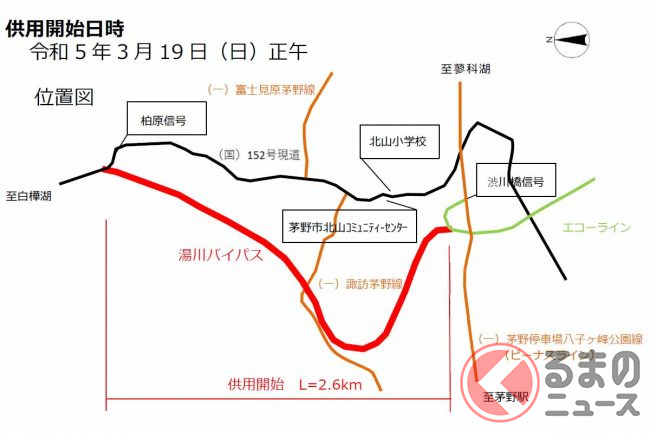 国道152号の湯川バイパスが開通します。これにより、茅野市中心部から白樺湖方面へのアクセス性が向上します。