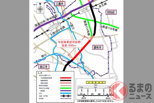 東京都は2023年3月1日、調布3・4・17号狛江仙川線(都道114号武蔵野狛江線)の一部区間について国土交通省から都市計画事業の認可を取得し、拡幅事業に着手すると発表しました。