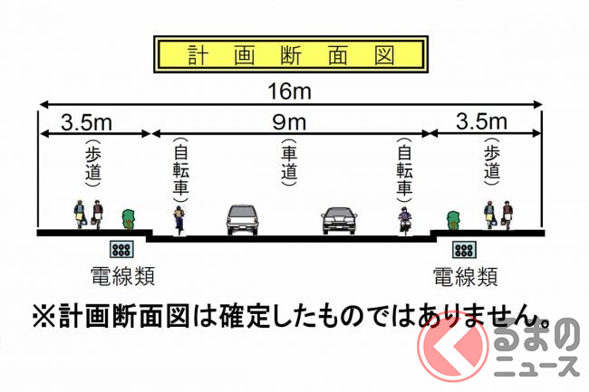 車道は現在と同じ2車線のままですが、自転車通行空間と幅3.5mの歩道が両側に整備されます。また、無電柱化や街路樹の植栽も行われます。