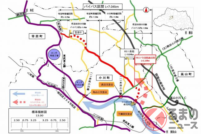 整備中のバイパスは、この国道254号小川バイパスのルートを直線状に短絡し、交通の分散と所要時間短縮を図る狙いがあります。