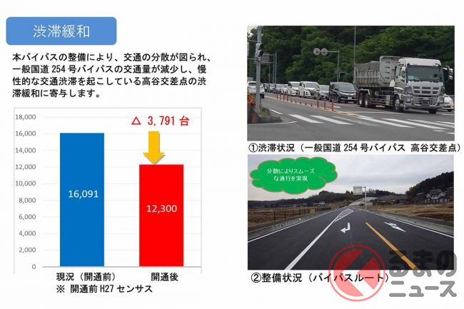 この区間には、既存の道として国道254号小川バイパスが通っていますが、県西部の幹線であることに加え、関越道の嵐山小川ICとホンダの埼玉製作所寄居工場などを結んでいることもあって混雑しており、途中の高谷交差点(小川町)では慢性的な渋滞を引き起こしているといいます。また、ルートが西へふくらんでおり、やや遠回りです。