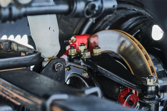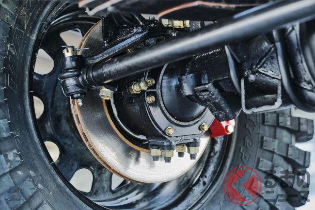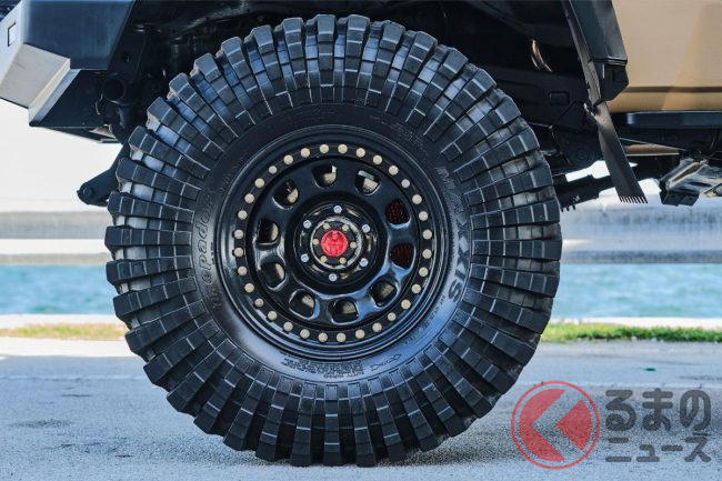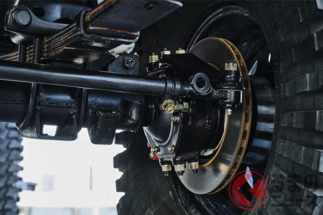 足回りを見ると、4インチのリフトアップサスペンションが装備され、16インチホイール巨大なオフロードタイヤを装備しています。またステアリングスタビライザーなども換装しており、オフロード性能をかなり強化しているようです。