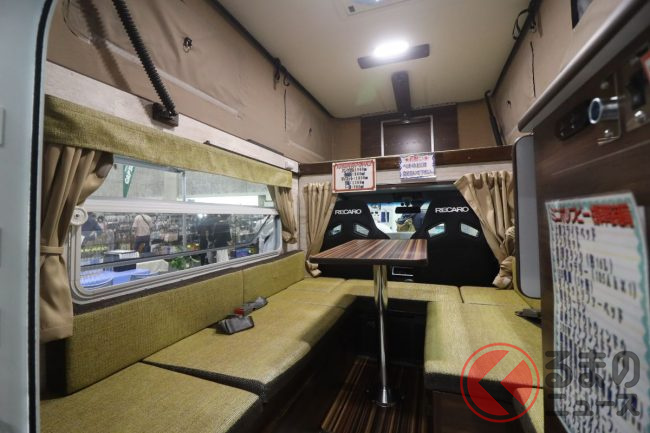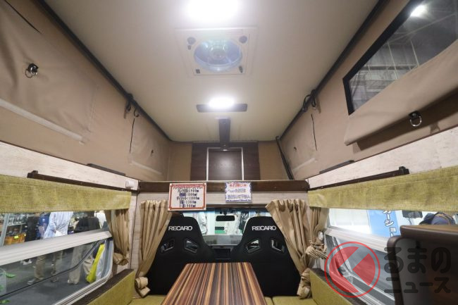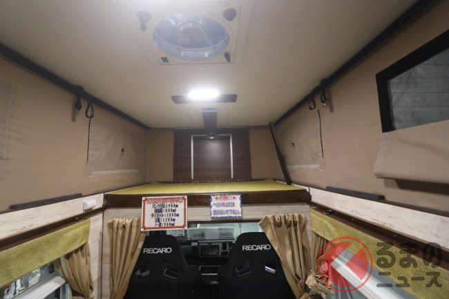 例えば、ダイハツ「ハイゼットトラック」をベースとした場合、ボディサイズ全長3395mm×全幅1475mm×全高1780mm-1885mmという小柄なボディサイズの荷台にサンドイッチパネル(全長2900mm×全幅1455mm×全高1345mm)の居住空間を架装することで、ダイネットソファーベッドに大人1人、上部のポップアップ部分に大人2人が就寝できます。
