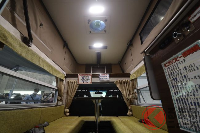 装備として壁型クーラー・大型インバーター・冷蔵庫・キッチン・入り口空間にはポータブルトイレもついていて、軽自動車とは思えないような内装になっています。