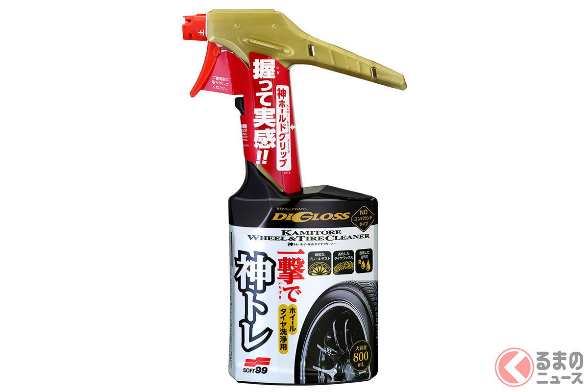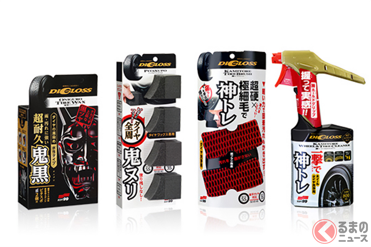 クルマのフロントガラス用撥水剤などカーケア商品を展開するソフト99は2023年3月1日、同社の自動車用ケアアイテム「DIGLOSS(ディグロス)」シリーズの第3弾として、「ディグロス 神トレ ホイール&タイヤクリーナー」「ディグロス 鬼黒 タイヤワックス」「ディグロス 神トレ タイヤブラシ」「ディグロス ピタスポ」を発売しました。また同日発売のレザーシート用クリーナー「ルームピア トレタナ 本革用」もあわせて発表されています。