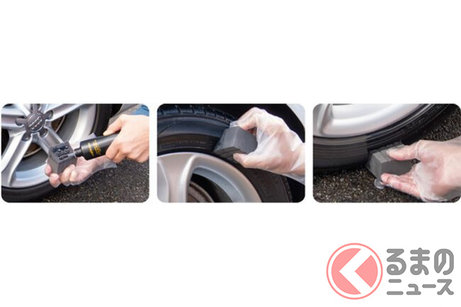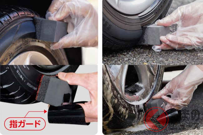 タイヤのサイドウォールにピッタリとフィットする形状で、クルマを移動させずともタイヤ全周にタイヤワックスを塗り込めるように工夫されているほか、グリップ部をVカットの形状とし、滑りにくく持ちやすい形状で施工性も良いといいます。