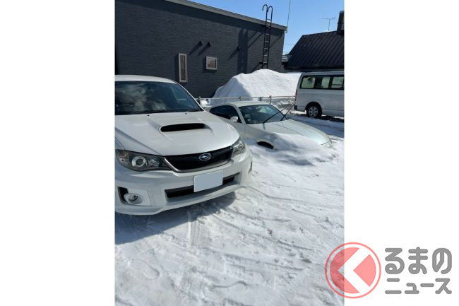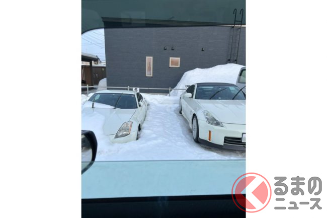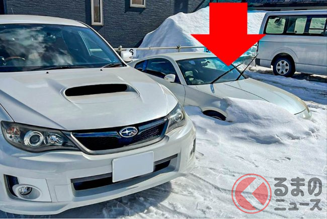 よく見ると、横に駐車しているクルマは日産「フェアレディZ」であることが分かるものの、雪に埋もれてしまっており、上半分だけが姿を見せている様子がうかがえます。