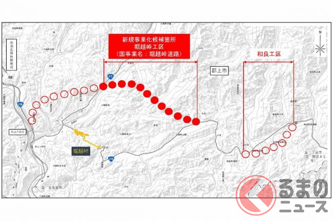 国土交通省は2月28日、新規事業候補箇所を発表し、さらに3月3日、堀越峠道路を候補箇所に追加。都道府県などへの意見聴取を始めるとともに、2023年度予算に向けた新規事業採択時評価の手続きに着手しています。