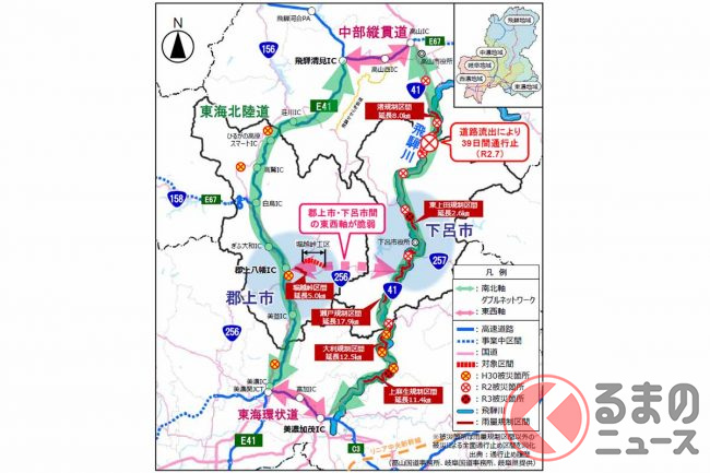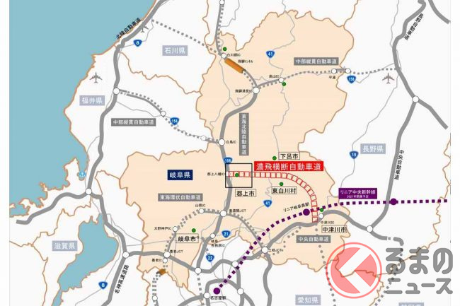 これに堀越峠道路が加わると、東海北陸道と国道41号を結ぶ東西軸としては、東海環状道と中部縦貫道(高山清見道路)のほぼ中間に位置することになり、道路網の機能が強化されます。