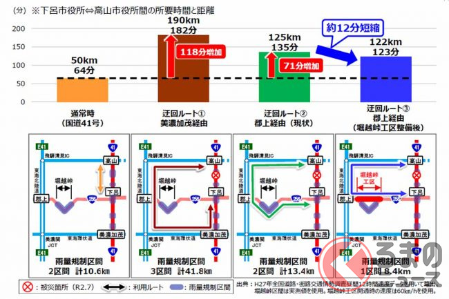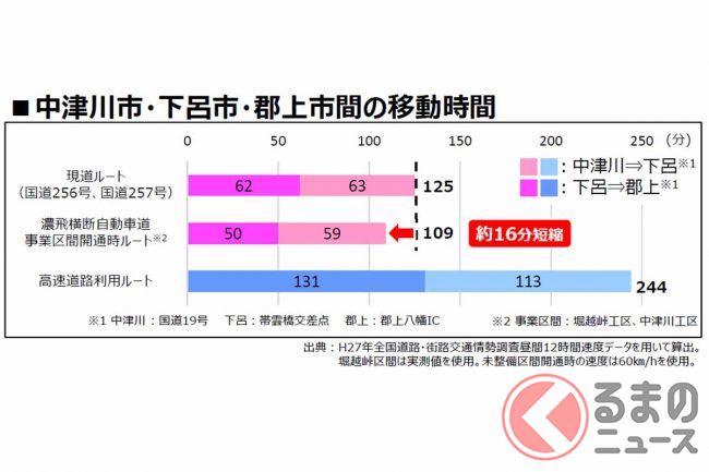国土交通省中部地方整備局岐阜国道事務所によると、郡上八幡ICから下呂(国道41号・257号の帯雲橋交差点)までの所要時間は、現道の62分から、開通後は50分に短縮される見込みです。