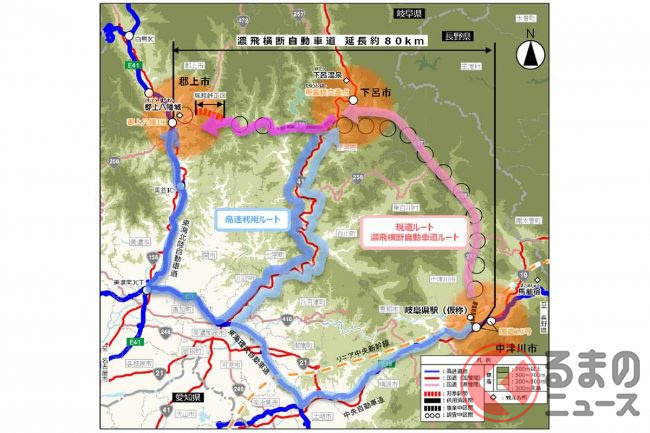 このように堀越峠道路は郡上市内の移動を改善する機能が期待できますが、この道路はそれだけにとどまりません。岐阜県内を走る地域高規格道路「濃飛横断道」に組み込まれる構想があります。