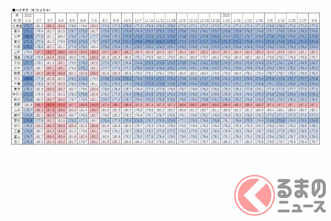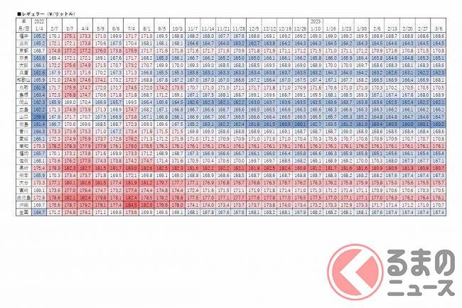 一方、最も高かったのは長崎県で180.7円、次いで鹿児島県176.1円、高知県176.1円でした。