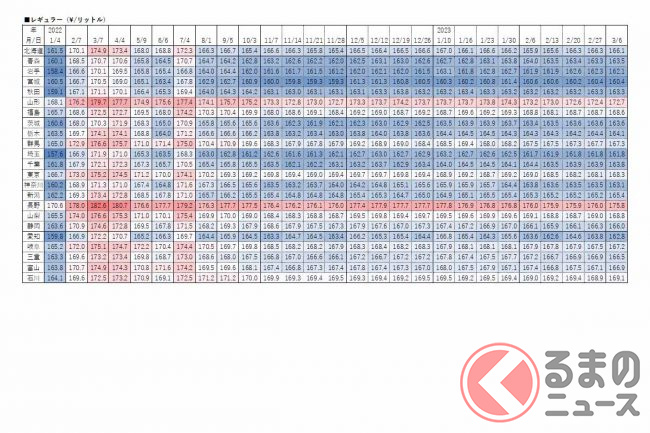 経済産業省資源エネルギー庁は2023年3月8日、レギュラーガソリンの6日時点の店頭小売価格(消費税込)を発表しました。