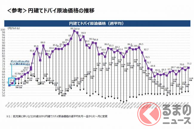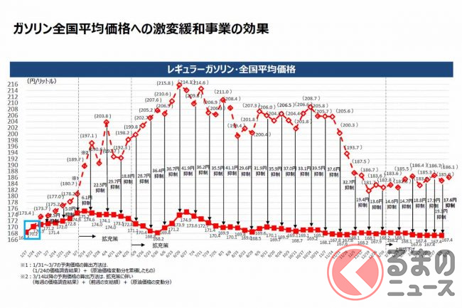 ガソリン価格の高騰を受け、政府は石油元売り企業に補助金を出す価格抑制策を実施。ガソリン、軽油、灯油、重油を対象に2022年1月から1リットルあたり5円、3月から25円、4月から35円を上限に支給しており、さらにそれでもガソリン1リットルの平均価格が170円(4月25日週以降は168円程度)を超過したら、その半分を支援すると発表しています。