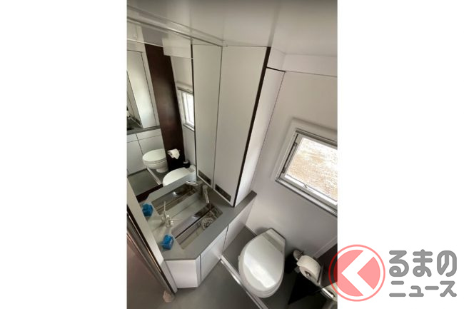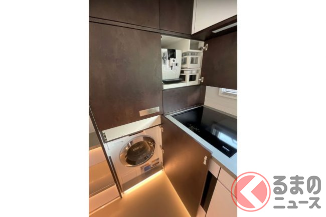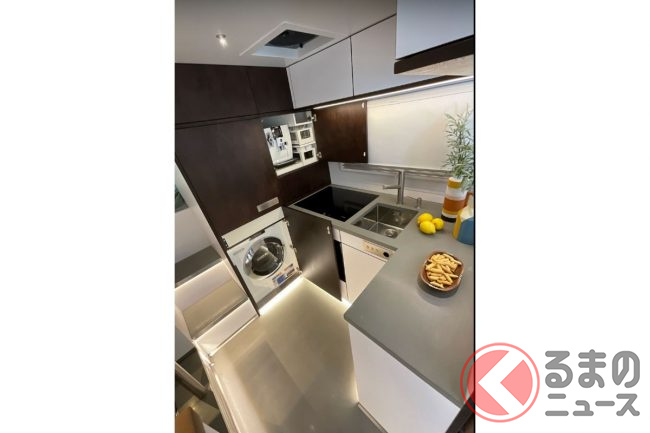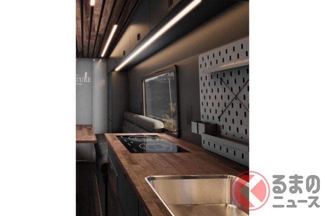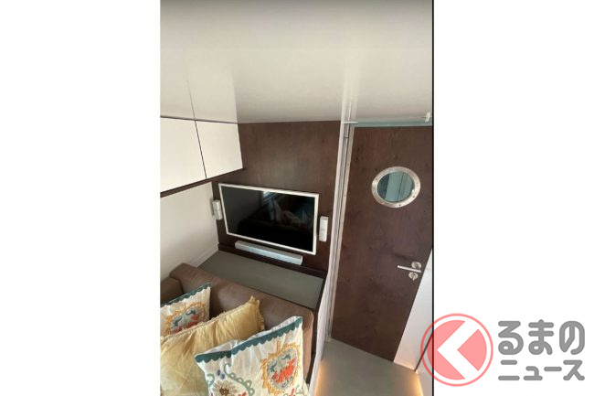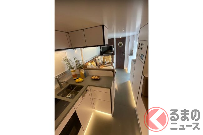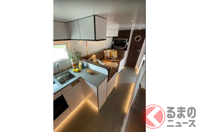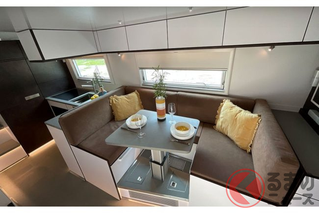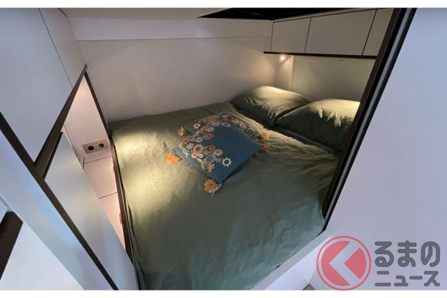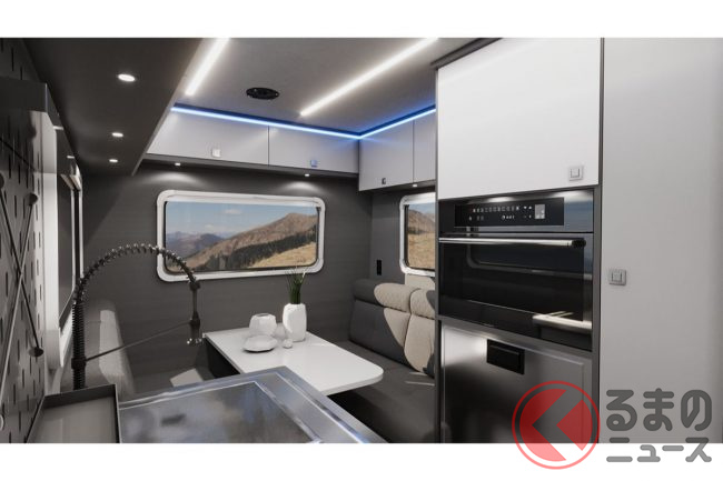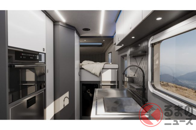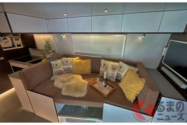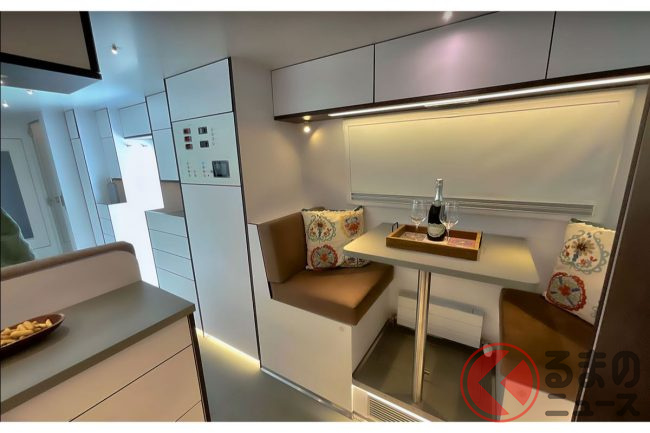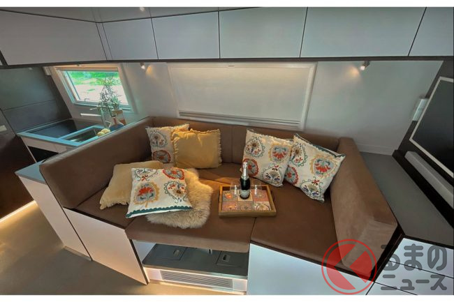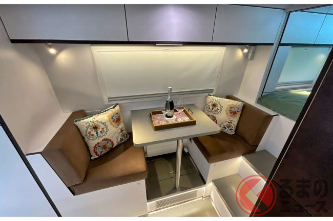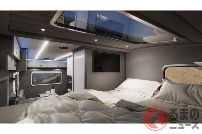 インテリアは、必要な機能はしっかり備えつつ、高級ホテルのような豪華なデザインに仕上がっています。車体上部にはキングサイズのベッドを配置するほか、テーブルを備えた車内のリビング部は、ゲスト用のクイーンサイズベッドにも変形できます。