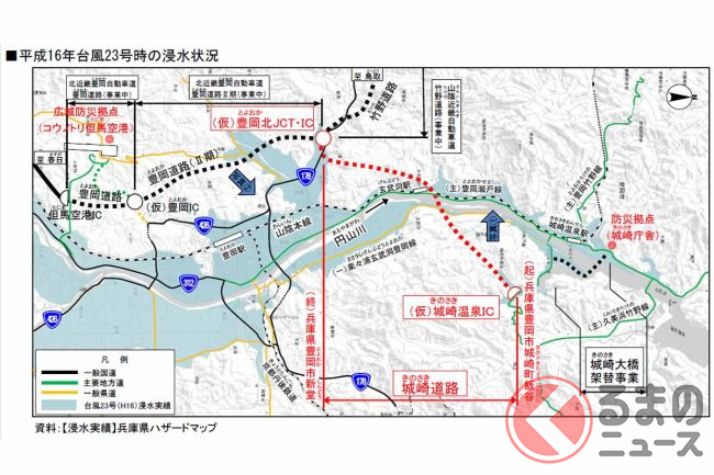 しかし、円山川は度々氾濫を起こしており、2004年の台風23号のときは、これらの県道や線路も浸水。豊岡市内で円山川を渡る国道178号(現道)も、約57時間にわたり通行止めを余儀なくされました。