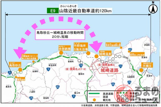 さらに、日本海沿いにある観光名所の鳥取砂丘や余部鉄橋、竹野海岸、城崎温泉、天橋立などを結ぶルートの一部となり、周遊時の時間短縮や観光振興を後押しすると期待されています。