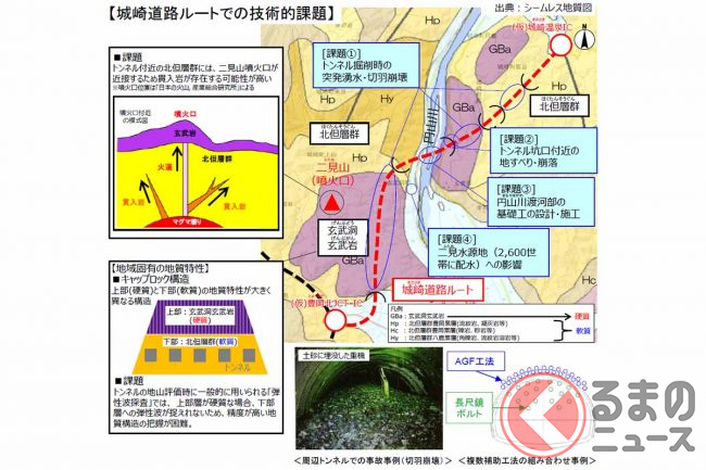 豊岡河川国道事務所が兵庫県に送付した調査によると、地域固有の地質特性(キャップロック構造)があることや、計画ルートの近くに約2600世帯に配水する二見水源地があることなどにより、トンネル掘削時の突発湧水や切羽崩壊、坑口付近の地滑りや岩盤崩落、水源地への影響など、技術的課題があるとのこと。