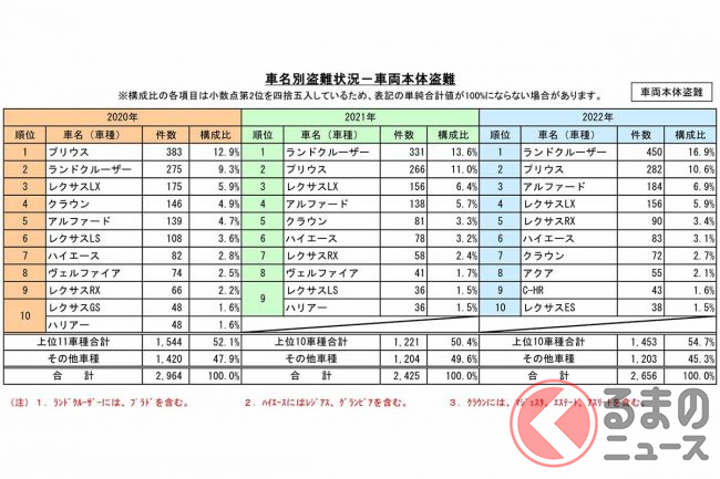 このほか、2022年の盗難被害が多かった車種は、「レクサスLX」「レクサスRX」「ハイエース」「クラウン」「アクア」「C-HR」「レクサスES」と続きます。