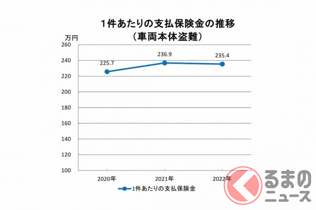 1件あたりの平均支払保険金は235.4万円で、2021年から2022年にかけてほぼ横ばいです。