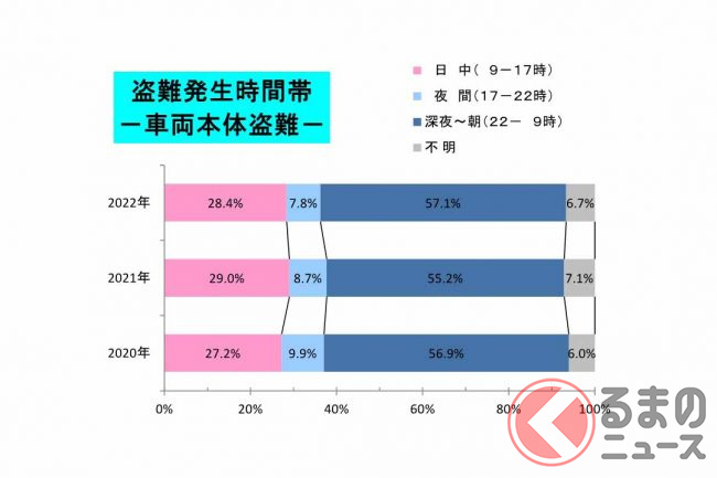 盗難は、車両本体・車上狙いのいずれも半数以上が深夜22時から朝9時にかけての時間帯に発生しています。