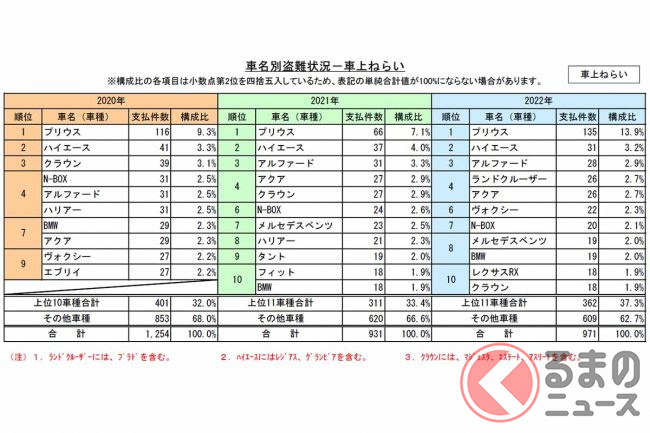 車上狙いは971件のうち、プリウスが135件で最も多く、以下、ハイエース31件、アルファード28件、ランドクルーザーとトヨタ「アクア」各26件、トヨタ「ヴォクシー」22件、ホンダ「N-BOX」20件、メルセデス・ベンツとBMW各19件、レクサスRXとクラウン各18件と続きます。