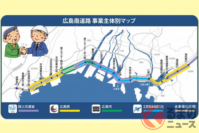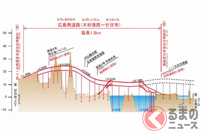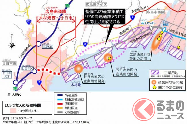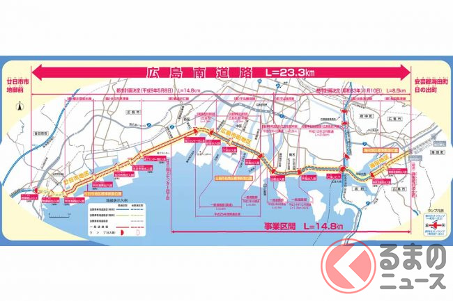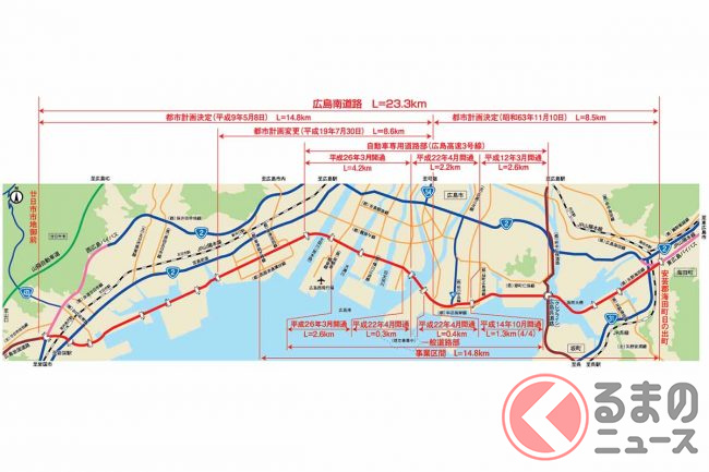 国土交通省中国地方整備局広島国道事務所によると、東広島市役所から広島市役所までのクルマの所要時間は現在の約76分から、開通後は30分ほど短い約46分になる見込みです。また、現道の国道2号の混雑緩和も期待されています。