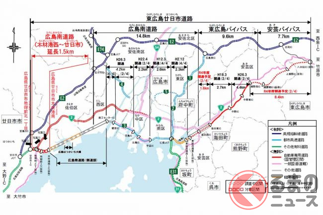 なお、東広島バイパス(安芸バイパス)に接続する西条バイパスは、暫定2車線から完成4車線への拡幅計画が動きを見せています。