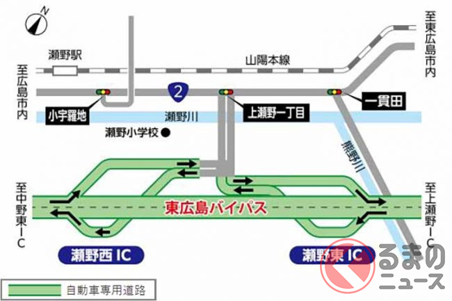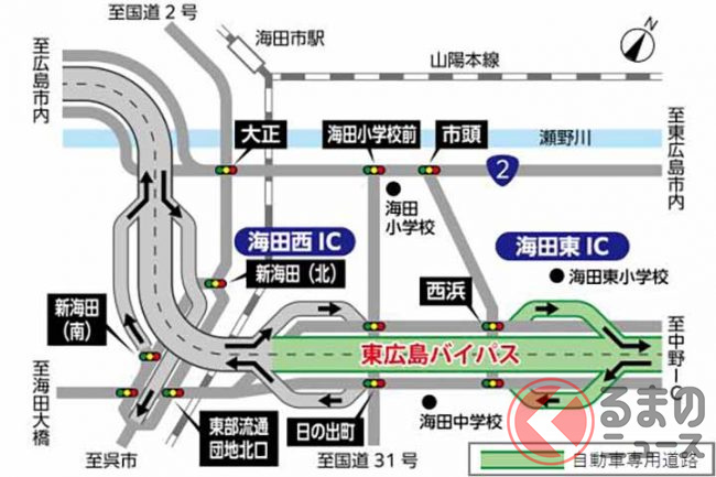 この開通により、広島県竹原市を起点とする国道2号の田万里バイパスから西条バイパス、安芸バイパス、東広島バイパス、新広島バイパスまでが1本につながり、広島市街から東広島市や広島空港方面のアクセス性が向上。