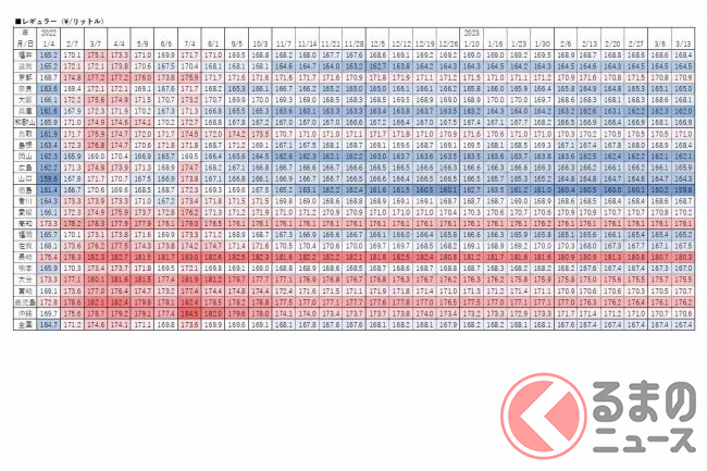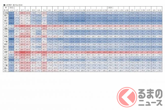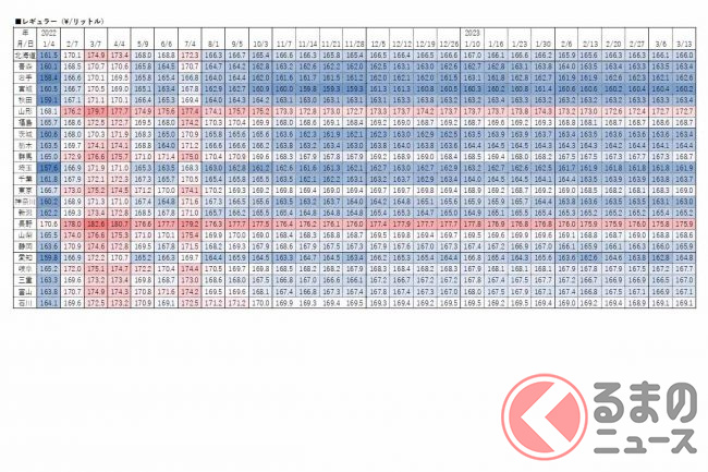 経済産業省資源エネルギー庁は2023年3月15日、レギュラーガソリンの13日時点の店頭小売価格(消費税込)を発表しました。