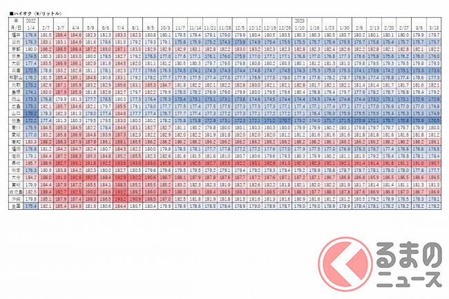 一方、最も高かったのは長崎県で180.3円、次いで鹿児島県176.2円、高知県176.1円でした。