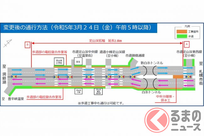 国土交通省北海道開発局札幌開発建設部は2023年3月14日、定山渓温泉(札幌市南区)を通る国道230号が、24日5時に4車線化すると発表しました。