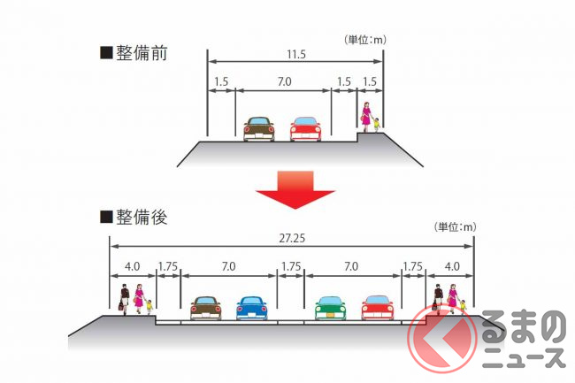 なお、車道拡幅後も一部で歩道や中央分離帯などの工事が続きます。