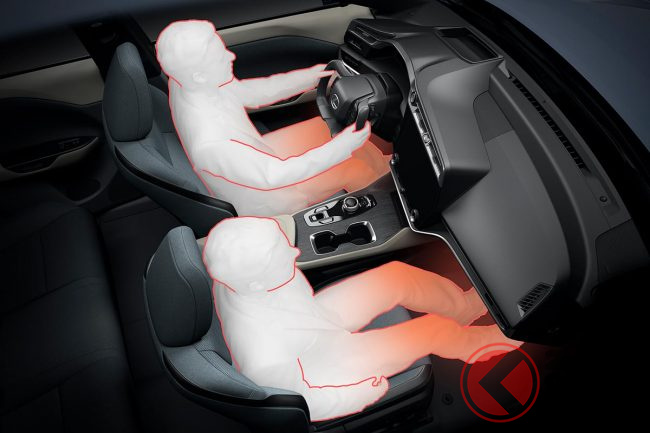 新型RZは「輻射ヒーター」を搭載。インストルメントパネル下部とステアリングコラムの裏側に輻射ヒーターを設置することにより、まるでこたつに入っているかのように、前席の乗員の膝まわりを素早く暖めてくれます。