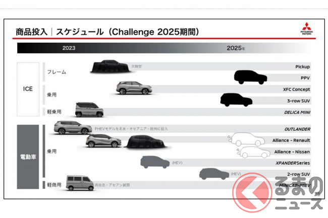 一方で、ICEモデル(内燃機関エンジン搭載)は7車種投入予定であることも示されており、5月登場の軽自動車「デリカミニ」や2022年に初公開されたSUVの「XFC コンセプト」をはじめ、ピックアップトラックや日本市場ではミニバンに相当するMPVなどがデビューします。