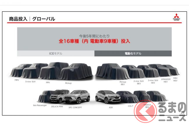 この目標に対し今後5年間で16車種を投入するとし、うち9車種は電動車となります。新型「ASX」(日本名「RVR」)や新型「コルト」に加え、「エクスパンダー」のハイブリッド仕様など、具体的に車名が記載されているものや、2列SUV、ルノー日産三菱のアライアンスから供給される新型EVなど、詳細が不明なクルマの登場も示唆。