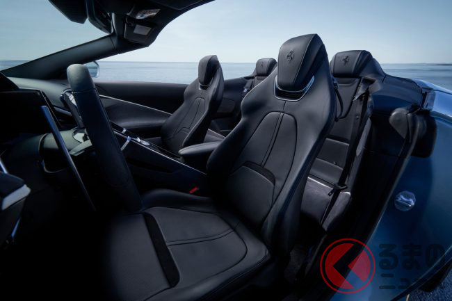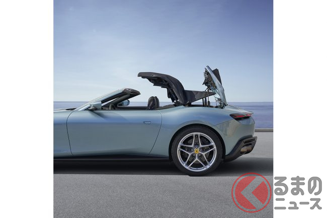 新型ローマスパイダーは、V型8気筒ツインターボを搭載した2ドアクーペモデル「ローマ」のフォルムやスペックを受け継いでいますが、最大の特徴はソフトトップの採用です。