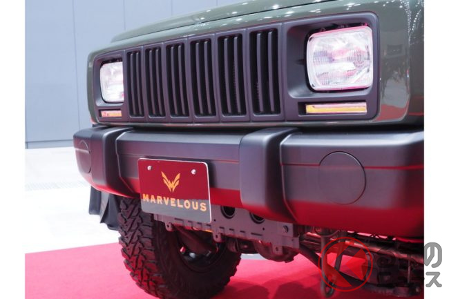 今回名古屋オートフェスティバル2023に出展された「ジムニー XJスタイル」は、フロントマスクを1990年代のジープ「チェロキー」(XJ系)風にカスタム。出展したMARVELOUは鳥取県に拠点を構えており、車両のカスタム以外にも、中古車及び関連商品の販売業務などを手掛けています。