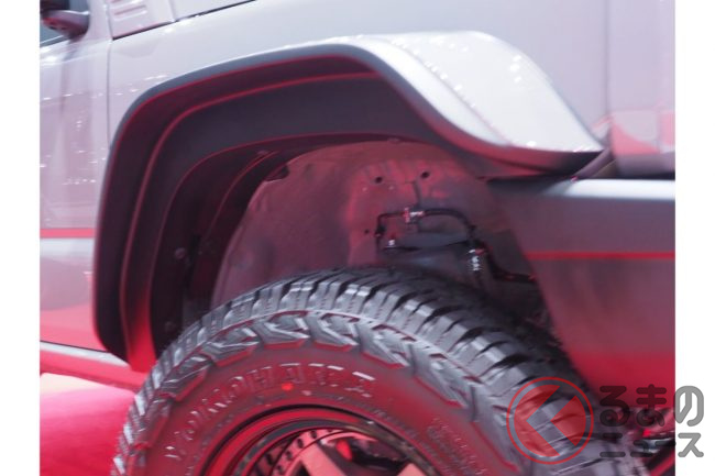 展示されたデモカーでは、ワイドフェンダーを取り付けたワイドモデルは車高を3インチ上げており、走破性能が高められていました。逆に軽自動車のナローモデルは1.5インチのリフトアップに留め、街乗りに適したスタイルになっています。