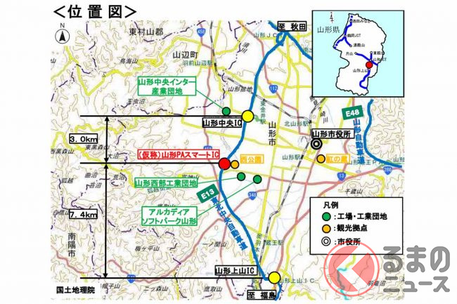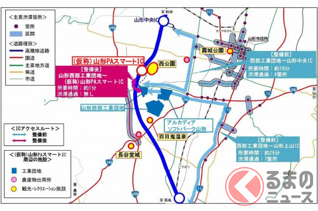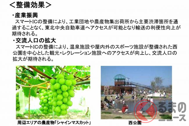 山形県によると、スマートIC周辺は、年間約30万人の来園がある西公園をはじめ、温泉、史跡、観光農園などのレジャー・観光施設や、工業団地、産業団地が隣接しており、さらには農作物集出荷所も点在。