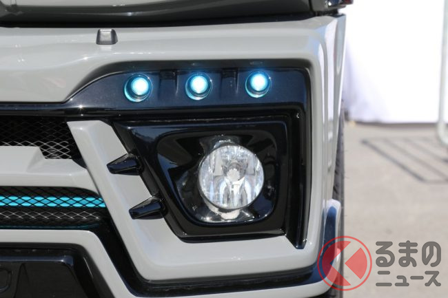 超ド迫力なスズキ「ジムニー」が凄い! 縦グリル&3本出しマフラーを装着! シアンランプが印象的! 反響多いエアロ仕様とは