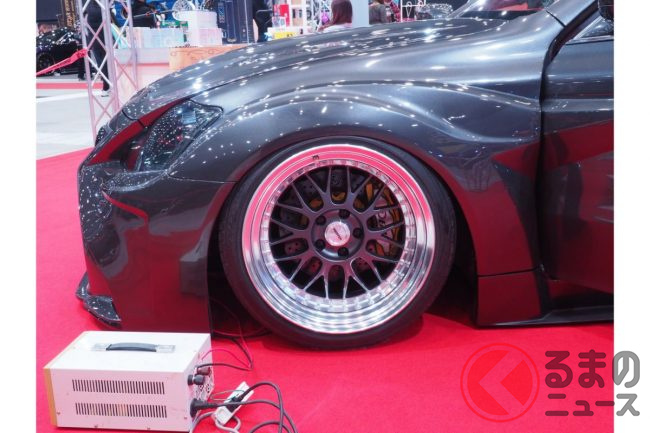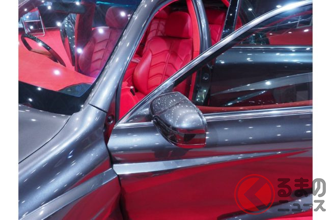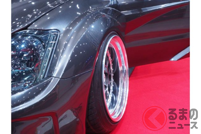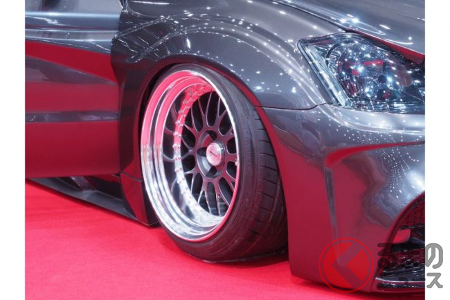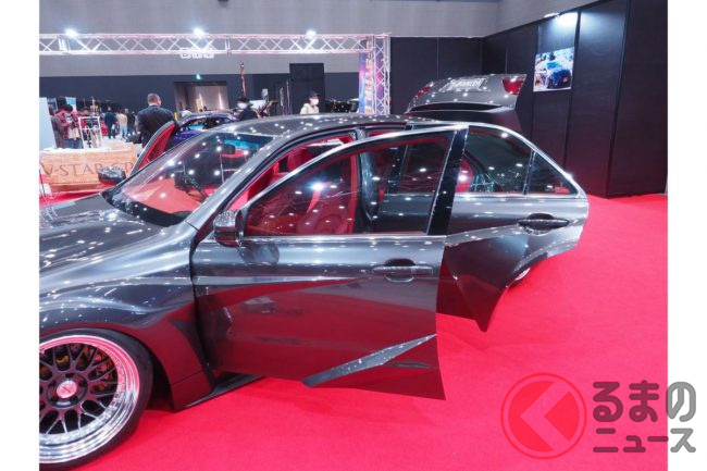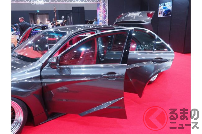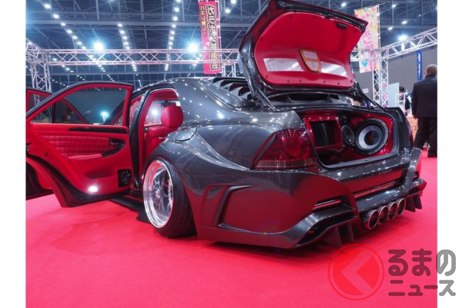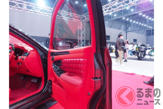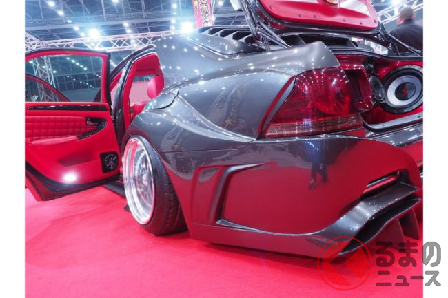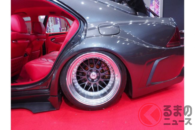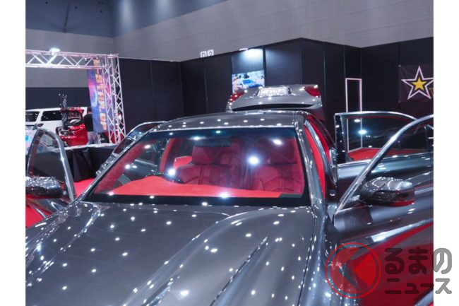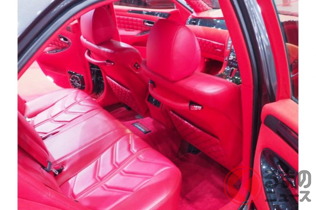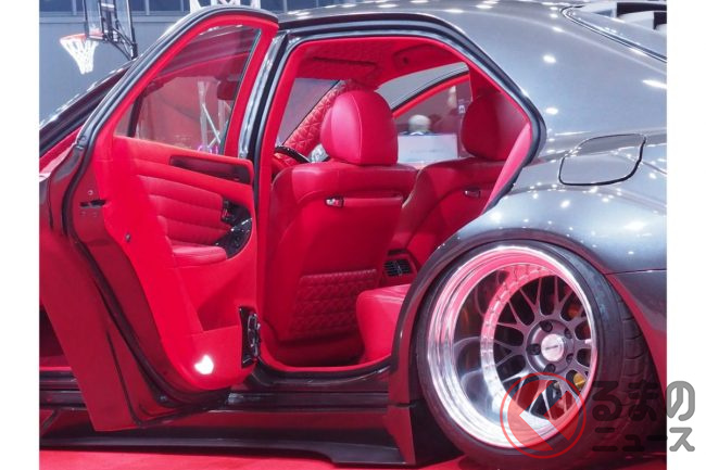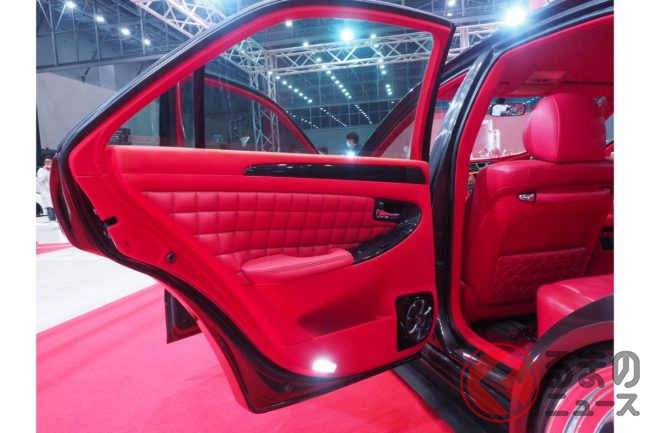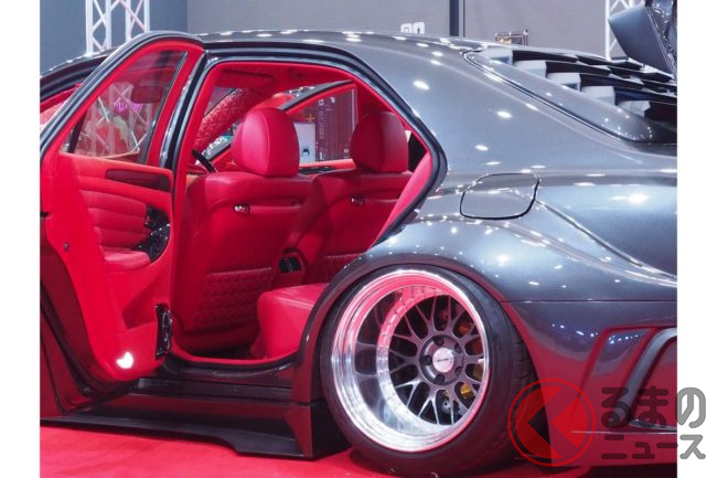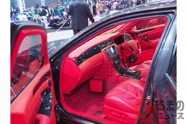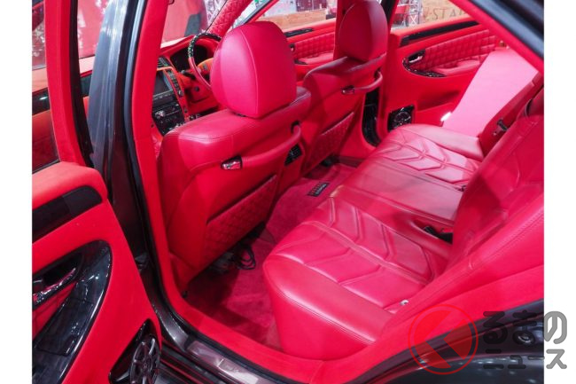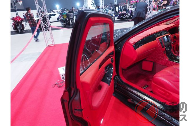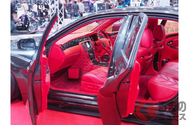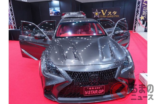 “レクサス顔”のトヨタ「クラウン」登場!? 超シャコタン&ド迫力ワイドボディ&豪華レッド内装! V-STARが展示したカスタムカーがスゴイ