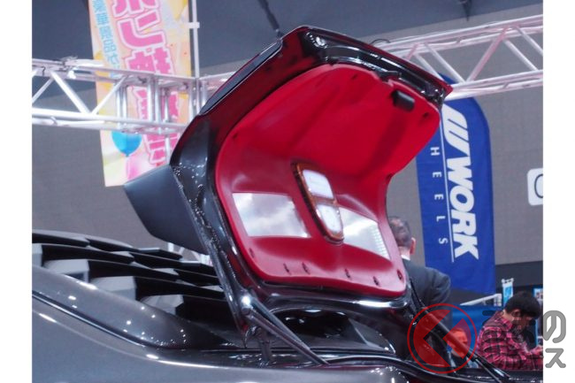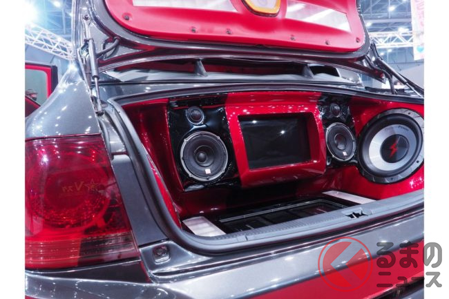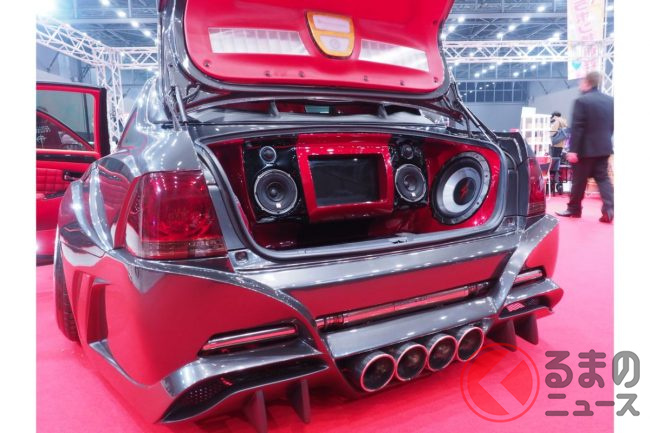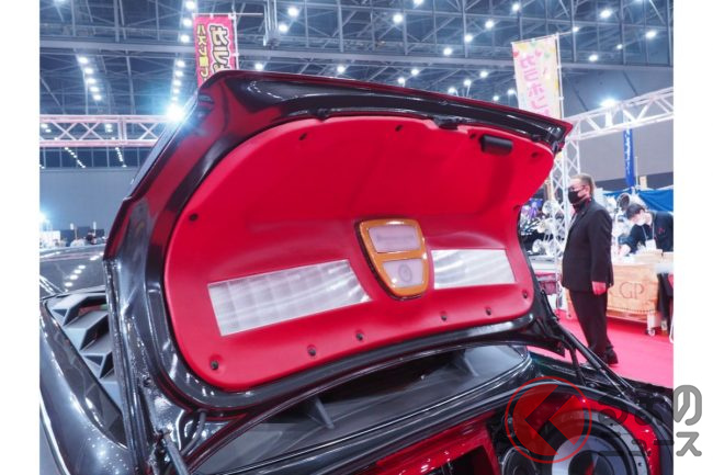 内装にも力が入っており、車内はトランクも含めすべて赤色で統一。トランクには、巨大なスピーカーも設置されるなど、内外装も含めほとんど原型をとどめていません。