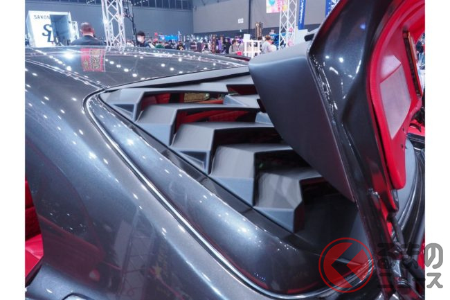 また車両側面では、ド派手なオーバーフェンダーが取り付けられ、それに伴ってドアの構造も大きく変更されています。さらにフロントボンネットは大きなダクト付きのものに換装され、リアウィンドウはルーバーに覆われています。