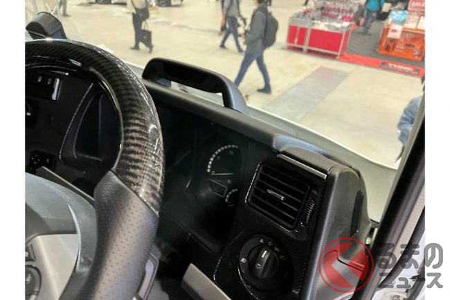 展示車両では、車内のステアリングホイールが、リバティーウォークのロゴを入れたレーシング風になっていました。