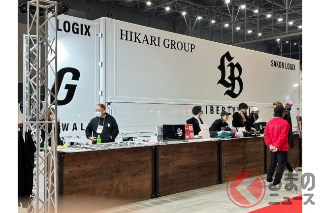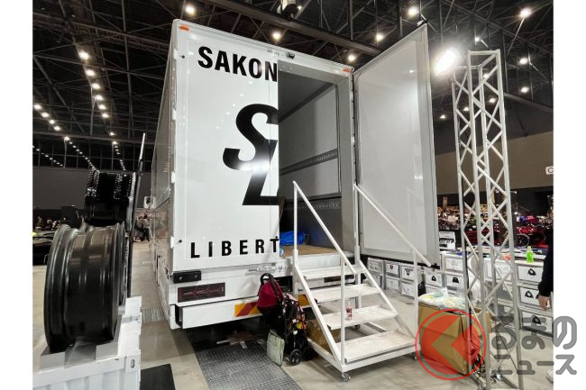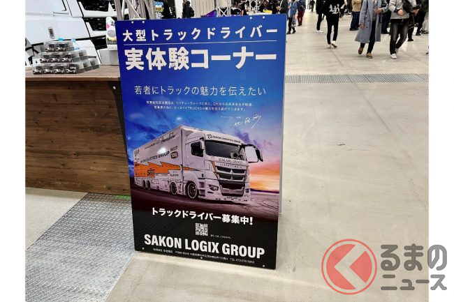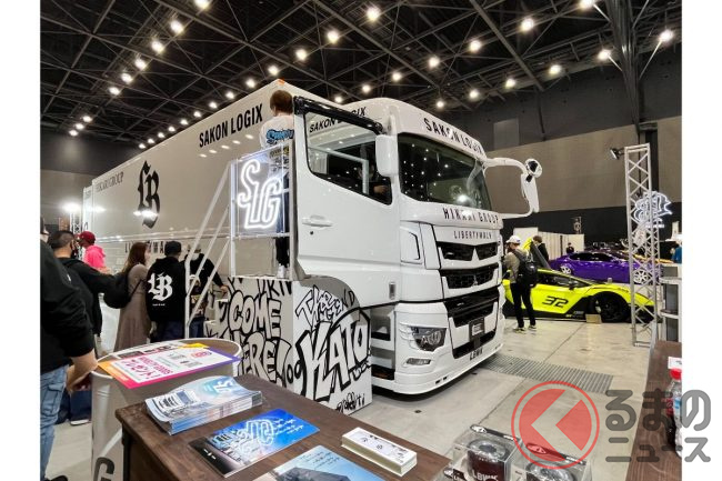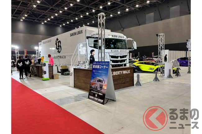 トラックとは思えない迫力を放つLB TRUCKS。リバティーウォークのブースでは、車両の展示に合わせ、有限会社左近商店のトラックドライバー募集も行われていました。