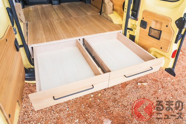 床板は分割で取り外しができ、走行時はコンパクトに収納できるほか、5名の定員乗車も可能なほか、床下収納や、室内外で使用可能なテーブルも用意され、多彩な利用ができる仕様となっています。