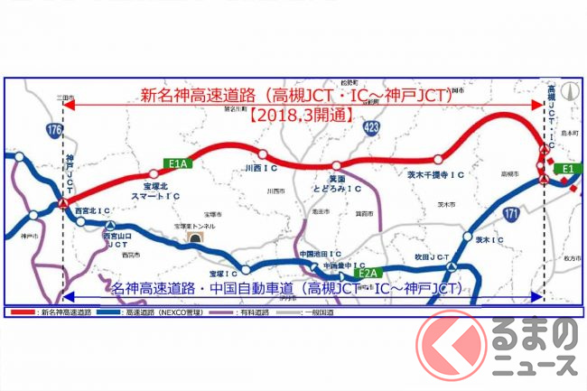 2017年12月10日の高槻JCT・IC~川西IC間に続き、2018年3月18日には川西IC~神戸JCT間が開通。これにより、名神高速と中国道・山陽道をつなぐ新たなルートができました。