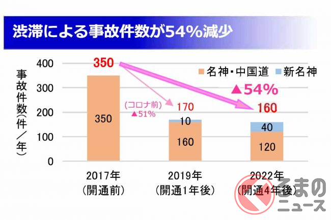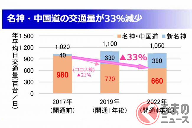 NEXCO西日本によると、新名神に並行する名神・中国道の2017年と2022年の状況を比較すると、交通量(日平均)は9万8千台から6万6千台に減少。渋滞も1040回から410回に、渋滞による事故も350件から120件に減りました。