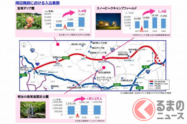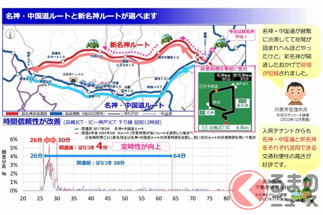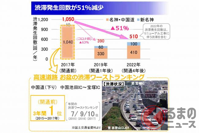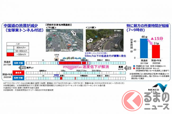 中国道の並行区間は宝塚東・宝塚西トンネル付近の渋滞が多く、下り中国池田IC→宝塚IC間は新名神開通前の2015年から3年連続でお盆の渋滞ランキングでワースト1になるほどでしたが、上下線を合わせた交通量は3割、渋滞は6割減ったといいます。